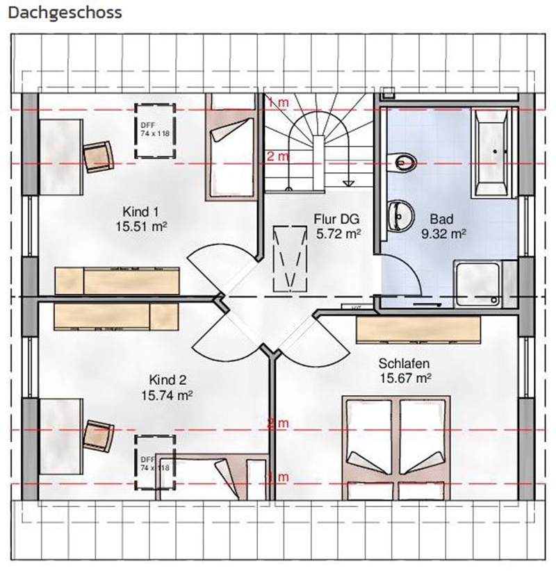Nutzfläche: 135m² - Geschosse: 1 1/2 - Satteldach 45° - Außenmaße: 9,75m x 9,26m