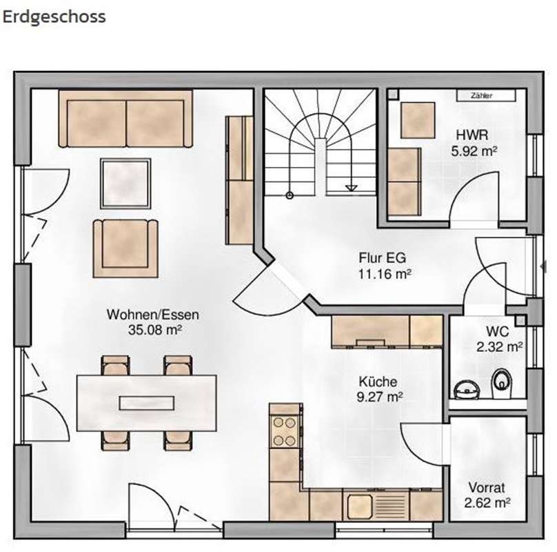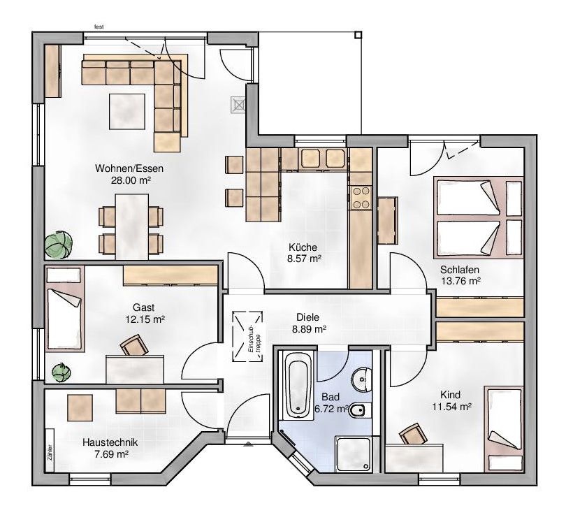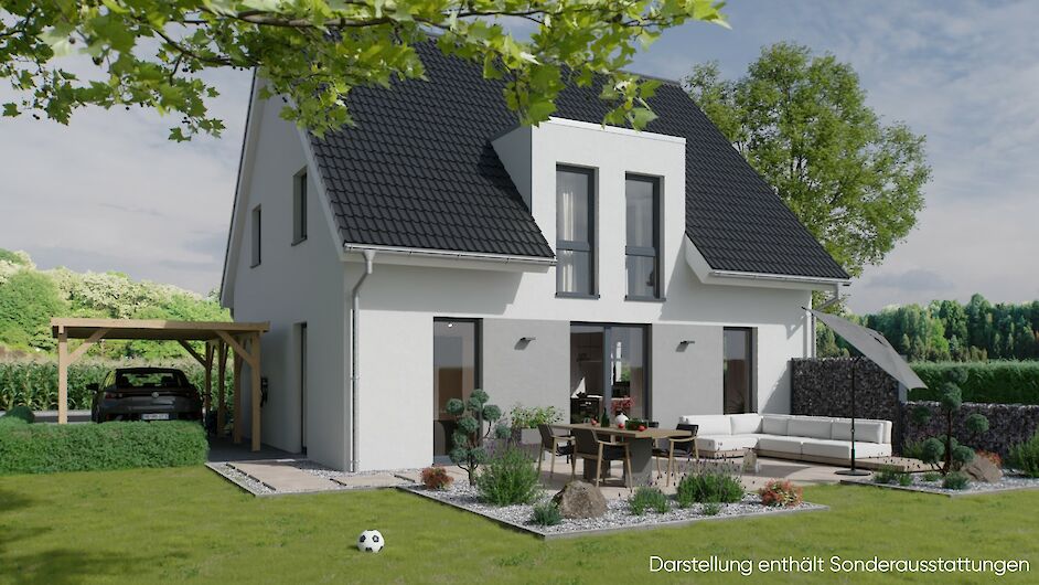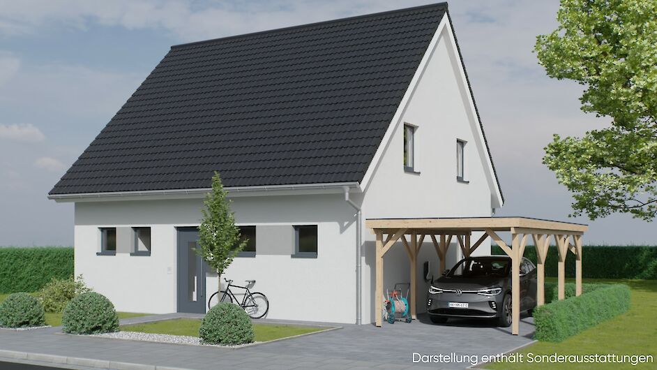 Dieses Haus ist ausgestattet mit einer Fußbodenheizung, Luft-Wasser-Wärmepumpe, etc.. Außerdem wählen Sie die Fenster- und Haustürfarbe, sowie die sanitäre Standardeinrichtung verschiedener Markenfirmen. Unser Preis versteht sich inklusive Bodenplatte und Erdarbeiten.