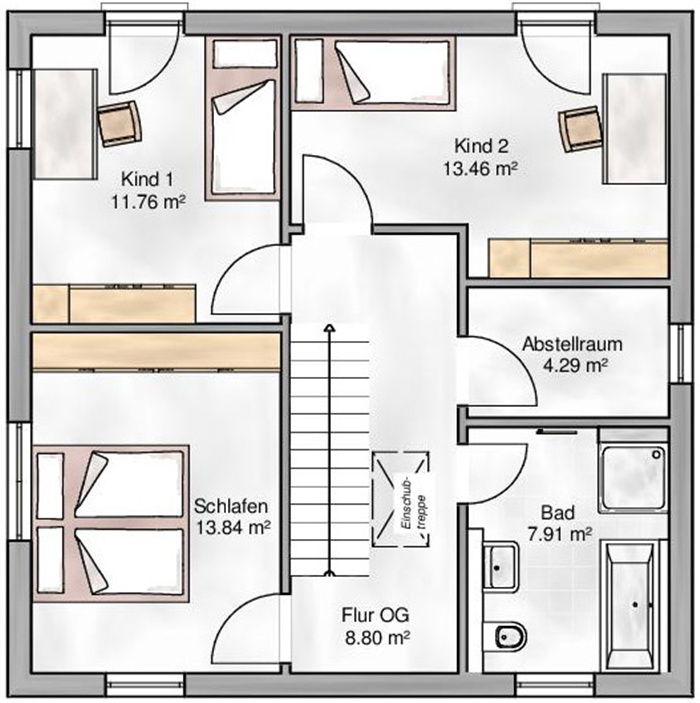 Nutzfläche: 114m² - Geschosse: 1 1/2 - Satteldach 35° - Außenmaße: 13,40m x 8,10m